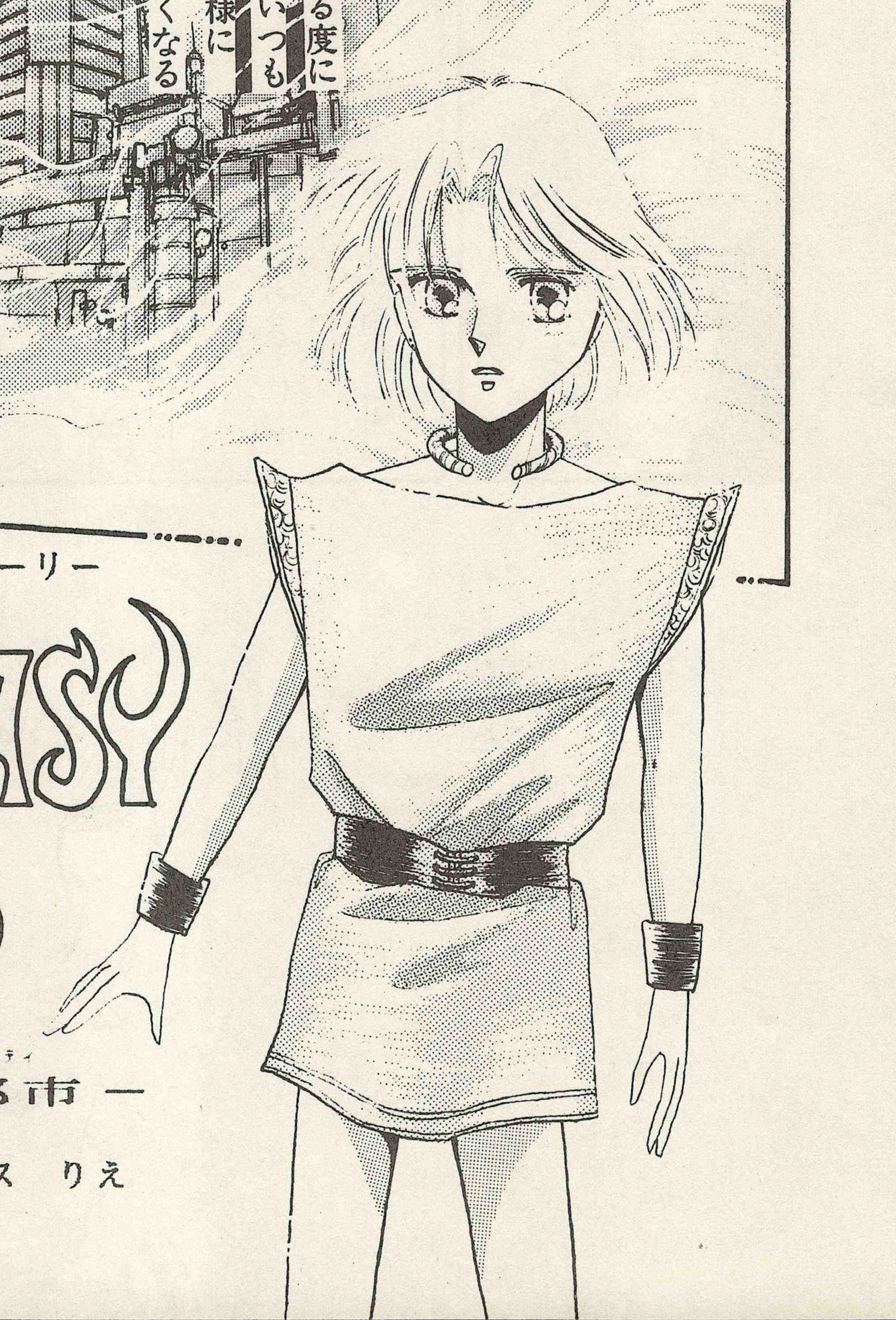 Kodama: Actually, when I created the first draft of the characters for Phantasy Star II, I made Lutz the main character. By the way, since so many people have asked whether Lutz is male or female, let me say a little about that. In the original story drafts of Phantasy Star, Lutz was a hermaphrodite, and as Alisa grew up, Lutz could become male or female. I thought that was interesting so I depicted Lutz that way."