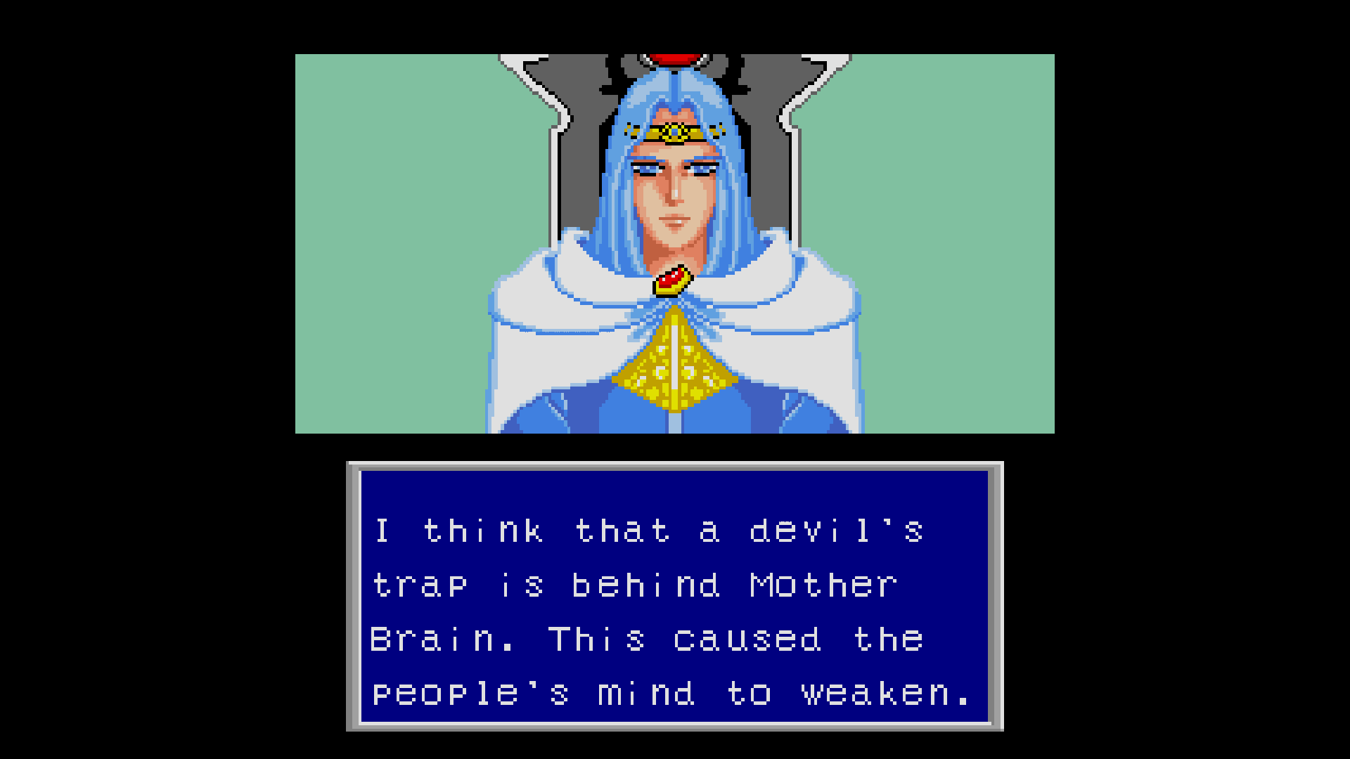 "There is still somebody in the ship!" the panicked esper exclaims. "You can't return again!" Rolf, confused, decides to investigate. The team walks beyond Mother Brain's chambers only to find the surprise of their life waiting for them.