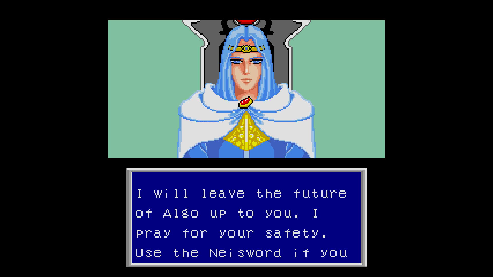 Lutz points toward a box nearby which holds the ninth and final Nei weapon: the Neisword. With the sword in hand, it will purify all evil that attempts to corrupt the group. As Rolf grabs the sword, Lutz asks if he and his friends are ready to battle the powers of evil. Rolf answers confidently that he is. Lutz bids the group farewell with his blessings, and reminds them to use the sword if they begin to fatigue on their journey.